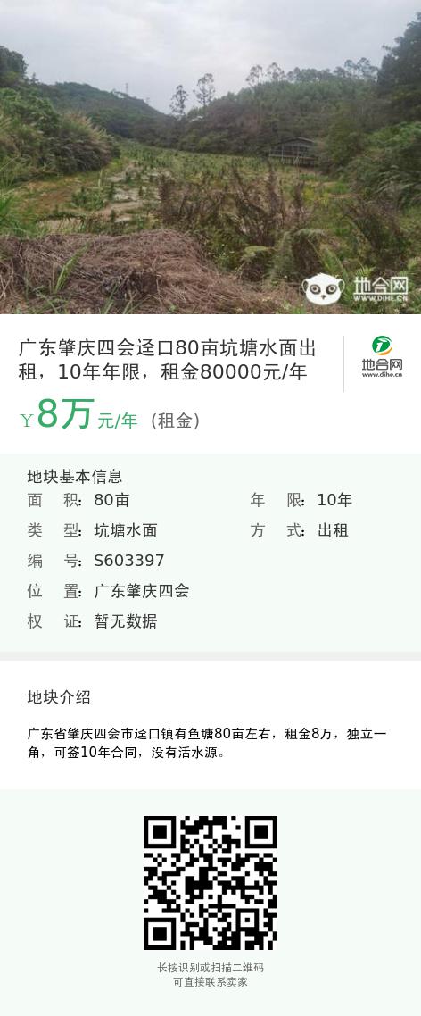 广东肇庆四会迳口80亩坑塘水面出租,10年年限,租金80000元/年